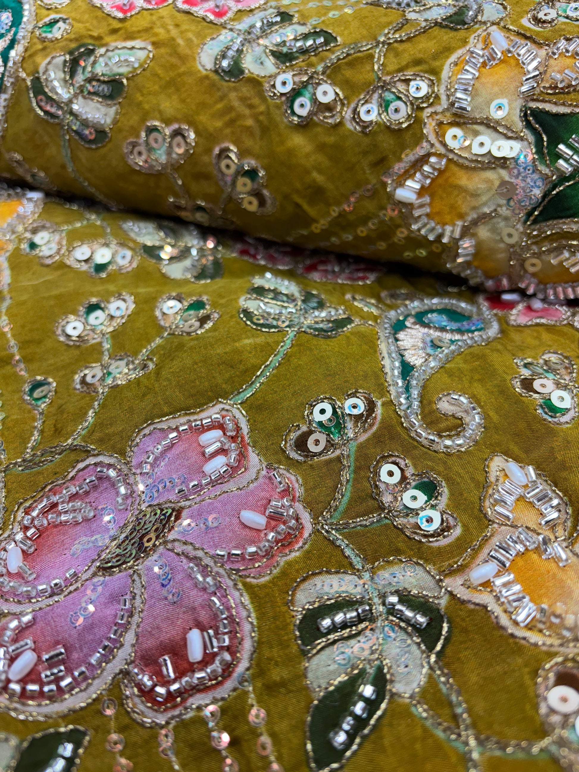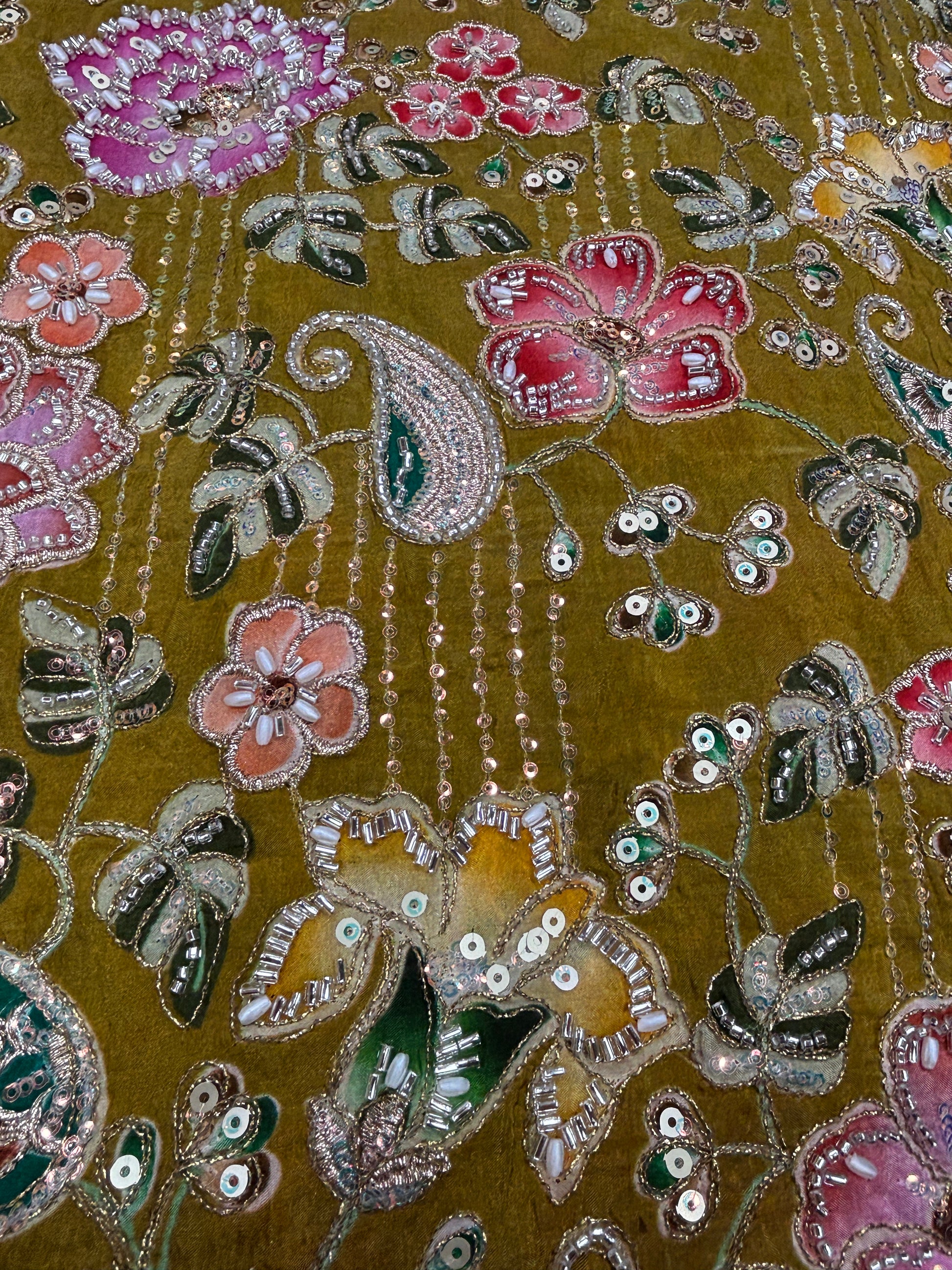 Immerse yourself in vintage beauty with Antique Olive Bloom. This luxurious olive green velvet fabric is adorned with hand-embroidered floral motifs in hues of pink, crimson, and gold. Fine beads, sequins, and delicate zari work add dimension and shimmer, making it perfect for regal occasionwear. Whether styled as a lehenga, jacket, or dupatta, this fabric ensures a royal look steeped in old-world charm.