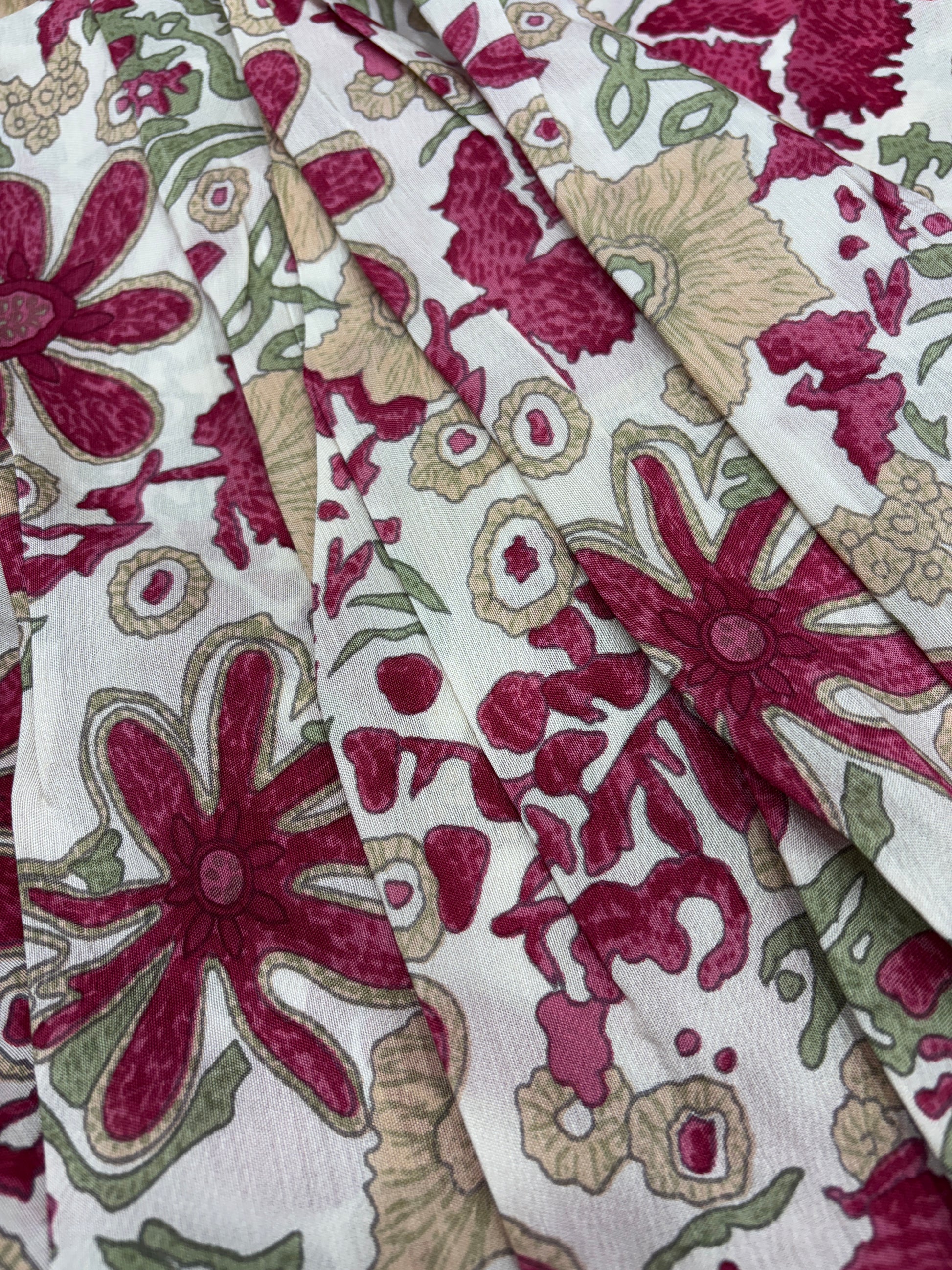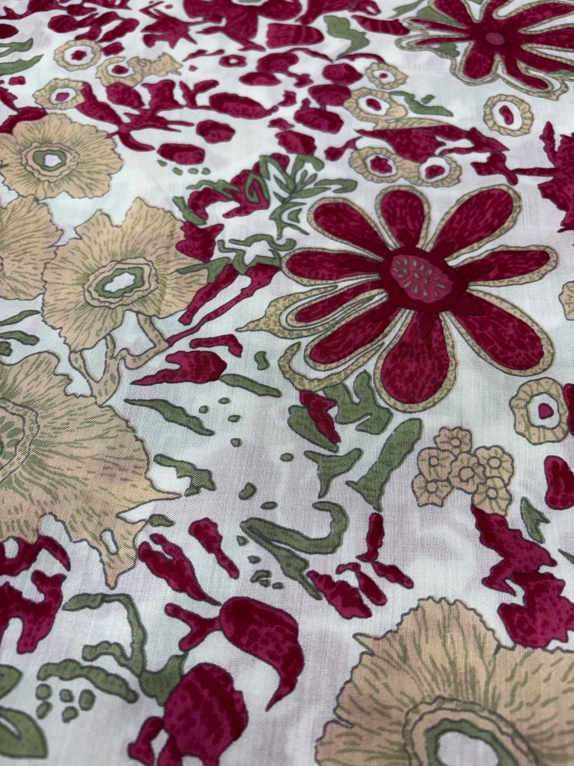 A classic meets contemporary creation — Blushed Vintage Garden is set on a soft ivory backdrop with wine red, olive green, and beige floral motifs scattered organically across the surface. The muted, hand-drawn style print brings a subtle vintage charm, ideal for elegant sarees, kurtas, or fusion ensembles. It’s perfect for those who love understated elegance with a nostalgic touch.
