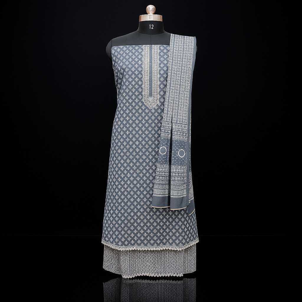 This charcoal grey set is a perfect blend of minimalism and ethnic grace. Featuring a kurta with white motifs and vertical embroidery, a geometric dupatta, and matching printed bottom, it creates a monochrome charm suited for classy gatherings.