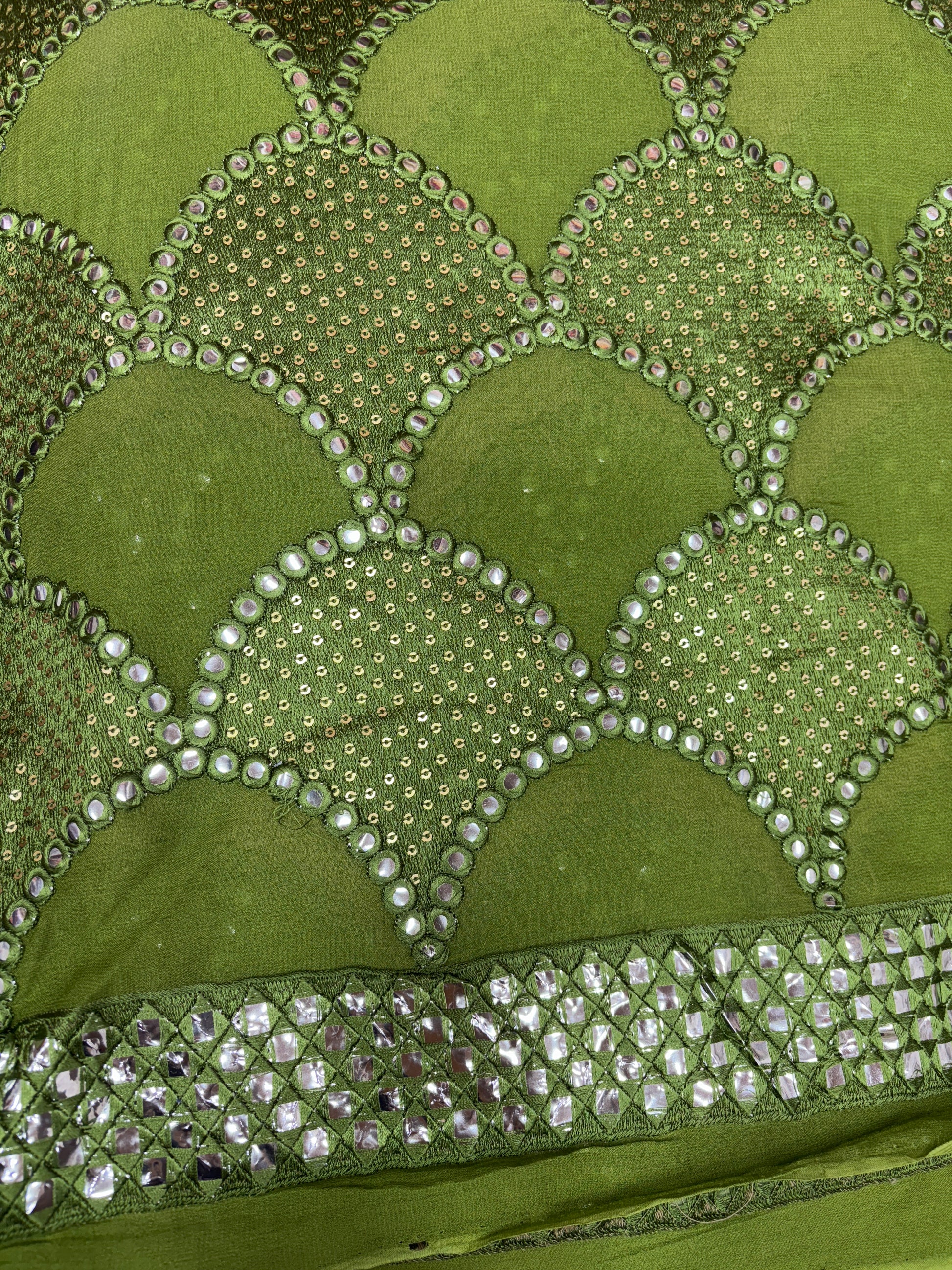 Echoing traditional mirror embroidery techniques, Emerald Mirror Scallops fabric flaunts a scalloped pattern intricately outlined with mirrors and threadwork. Crafted on an emerald green base, the luminous surface captures light beautifully, ideal for festive and bridal wear. This fabric makes stunning blouses, festive sarees, or statement dupattas.