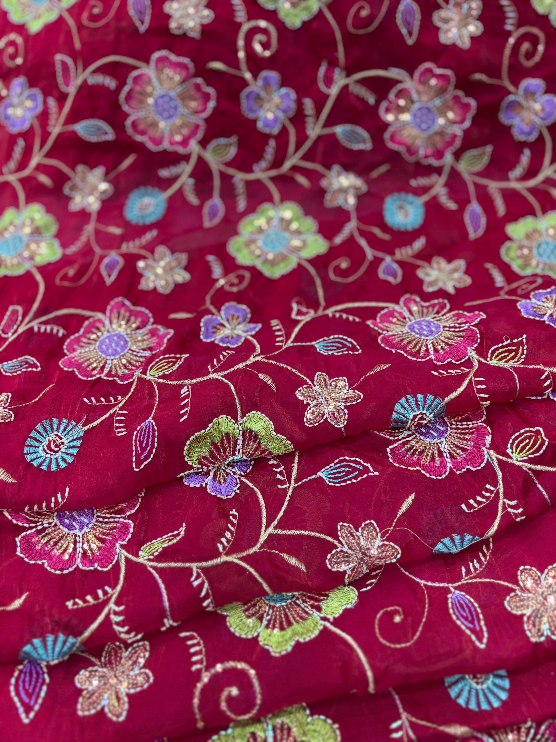 This fabric brings a joyful explosion of colors and sparkle on a bold ruby red base. Embellished with vibrant floral embroidery in shades of green, purple, turquoise, and pink, each flower is outlined with shimmering sequins that give it a festival-ready shine. Whether you're creating a lehenga, an anarkali, or a dramatic dupatta, this fabric will add a burst of joy and glam to your look.