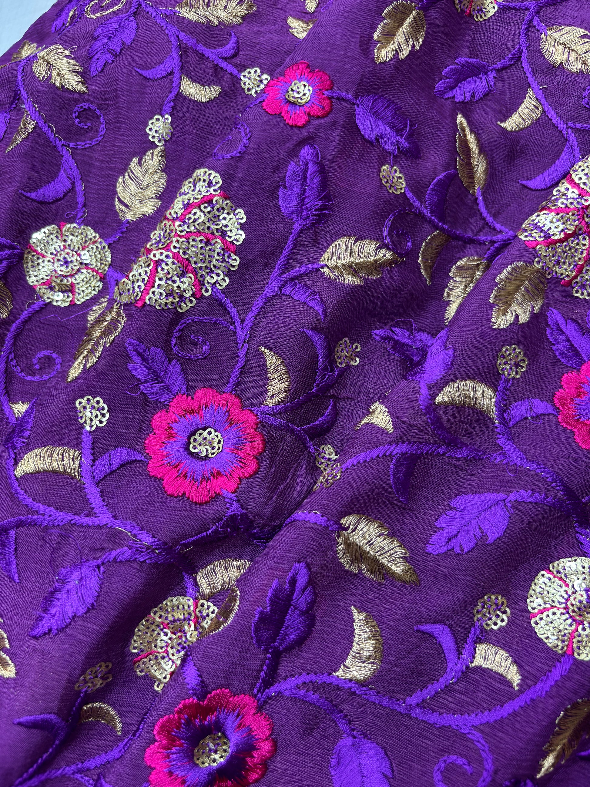 Dive into the richness of regal charm with this violet fabric that bursts with gold, magenta, and fuchsia floral embroidery. Woven with lustrous zari threads and embellished with sequins, each flower blooms like a garden under moonlight. The bold color and high-contrast floral design make it a show-stealer—ideal for bridal blouses, lehengas, dupattas, or even festive kurtis. This fabric brings royal elegance and vibrant energy together in one drape.