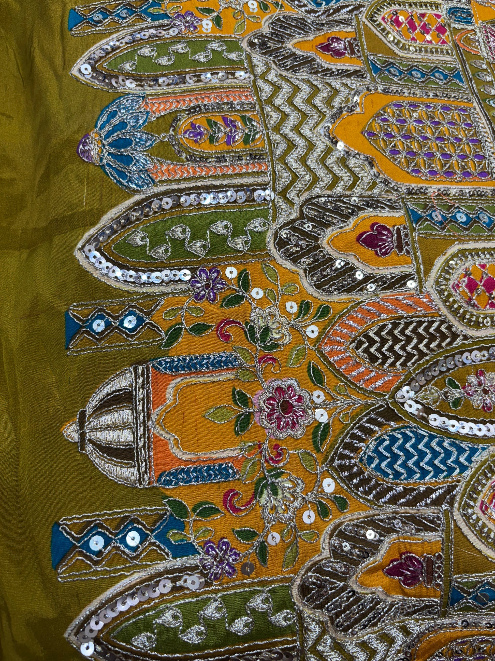 Step into the splendor of royal architecture with this mustard green fabric inspired by Mughal and Rajasthani haveli designs. Featuring ornate domes, arches, and jharokhas intricately embroidered in multicolored threads, the fabric is enhanced with metallic zari and reflective sequins. The bold architectural motifs framed with floral vines create a storytelling canvas that is ideal for statement lehengas, dupattas, or jackets for weddings and cultural festivities. A perfect choice for those who love heritage couture with a vibrant twist.