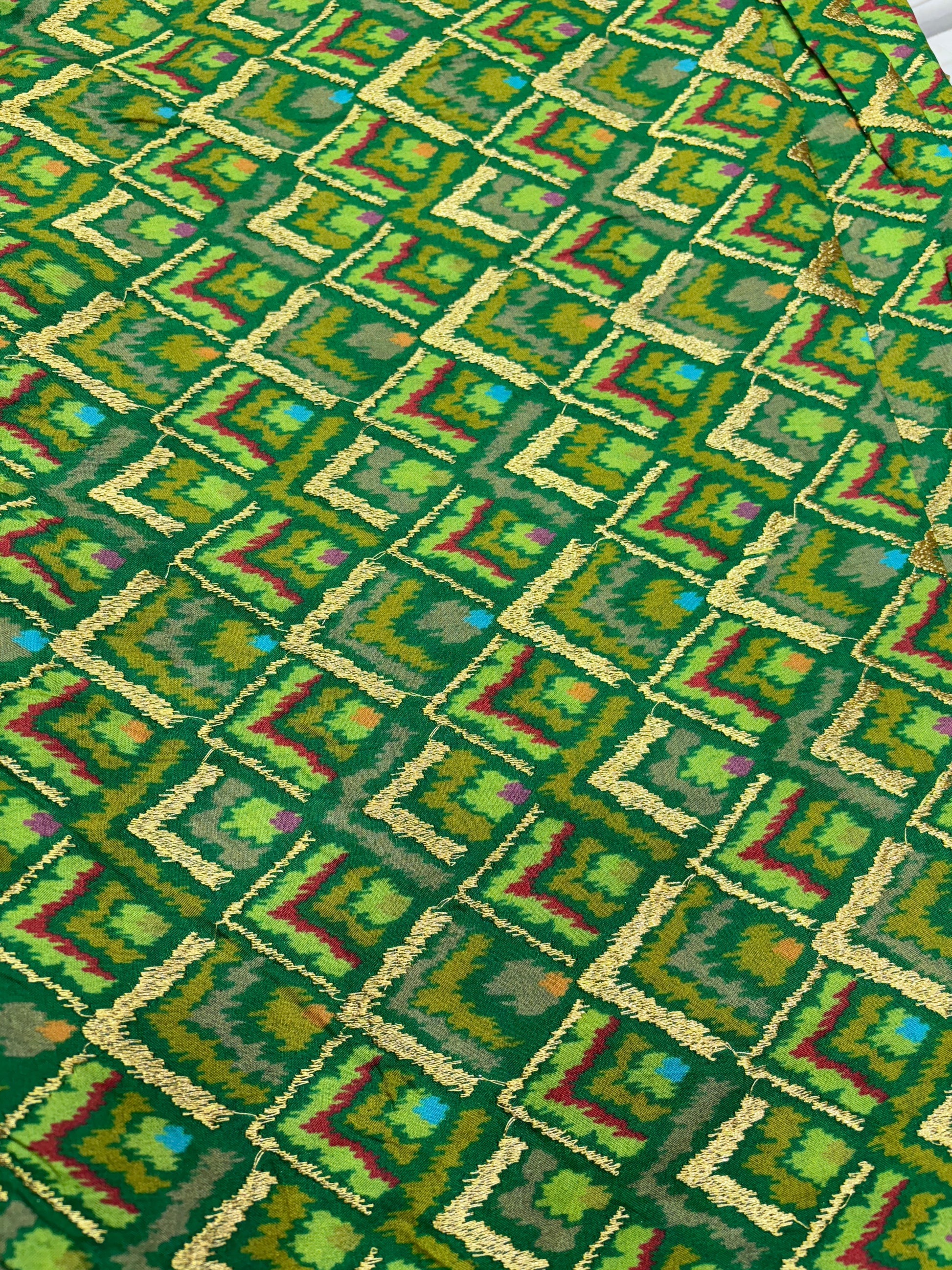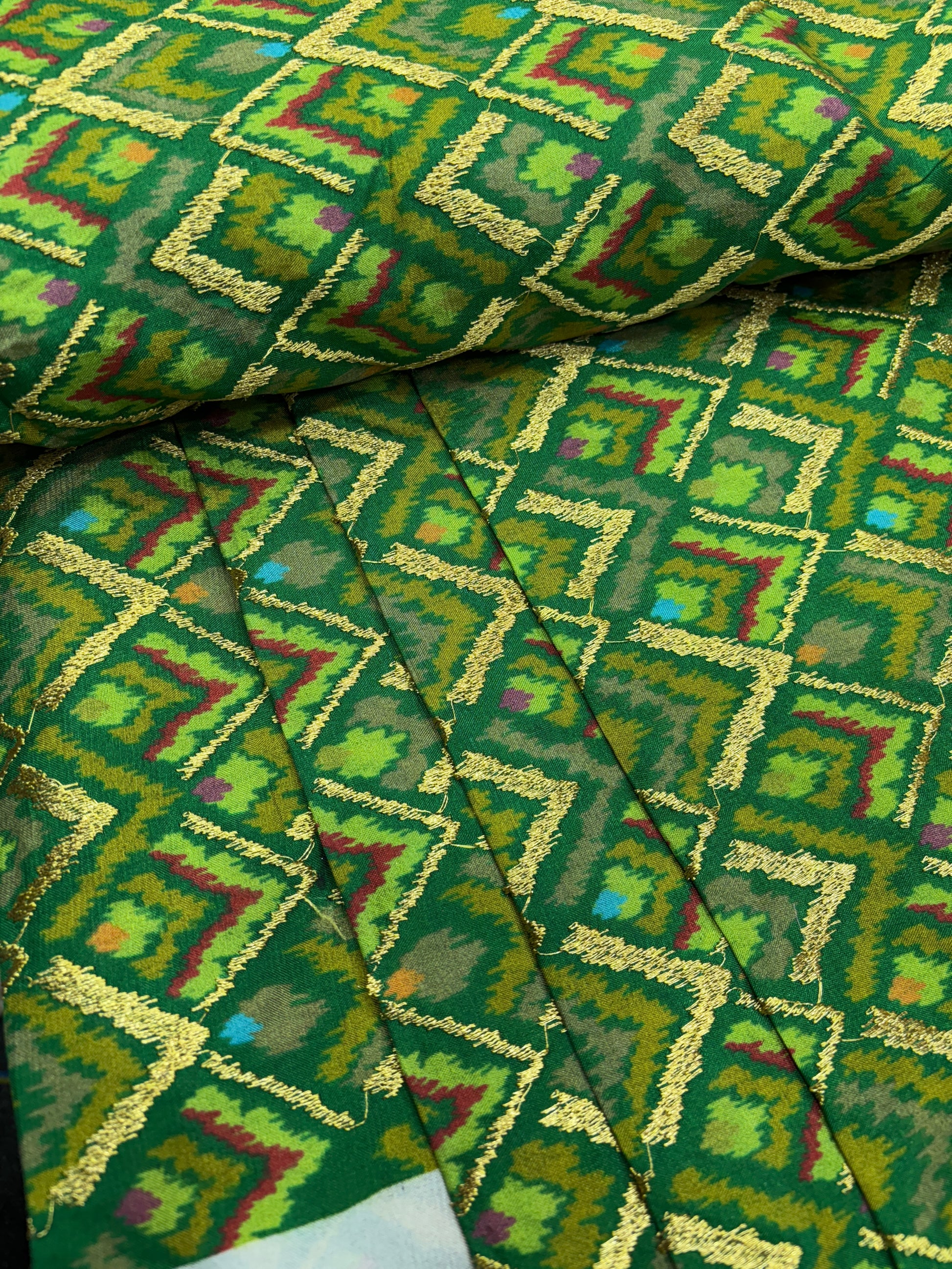 A fabric where art meets fashion — Iridescent Watercolor Garden features a soft satin base with bold, hand-painted style floral prints in hues of fuchsia, coral, and lush greens. Accentuated with fine gold sequin work tracing every petal and leaf, the fabric brings a subtle shimmer to the fluid print, ensuring you sparkle with every step. Lightweight yet luxurious, this fabric is ideal for crafting ethereal sarees, flowy gowns, or elegant co-ord sets. It beautifully balances romance and glam, making it perfect for day-to-evening festive wear.