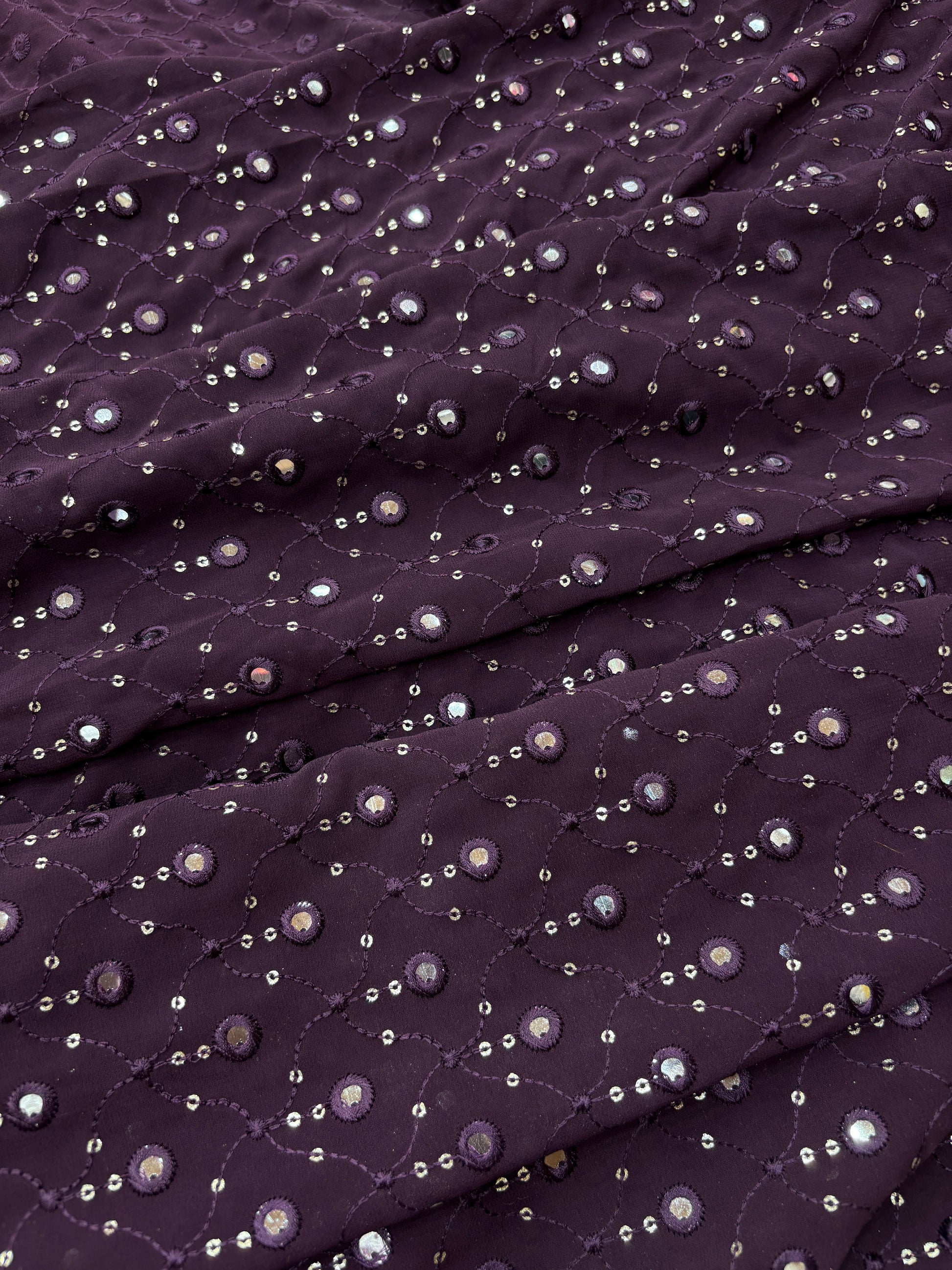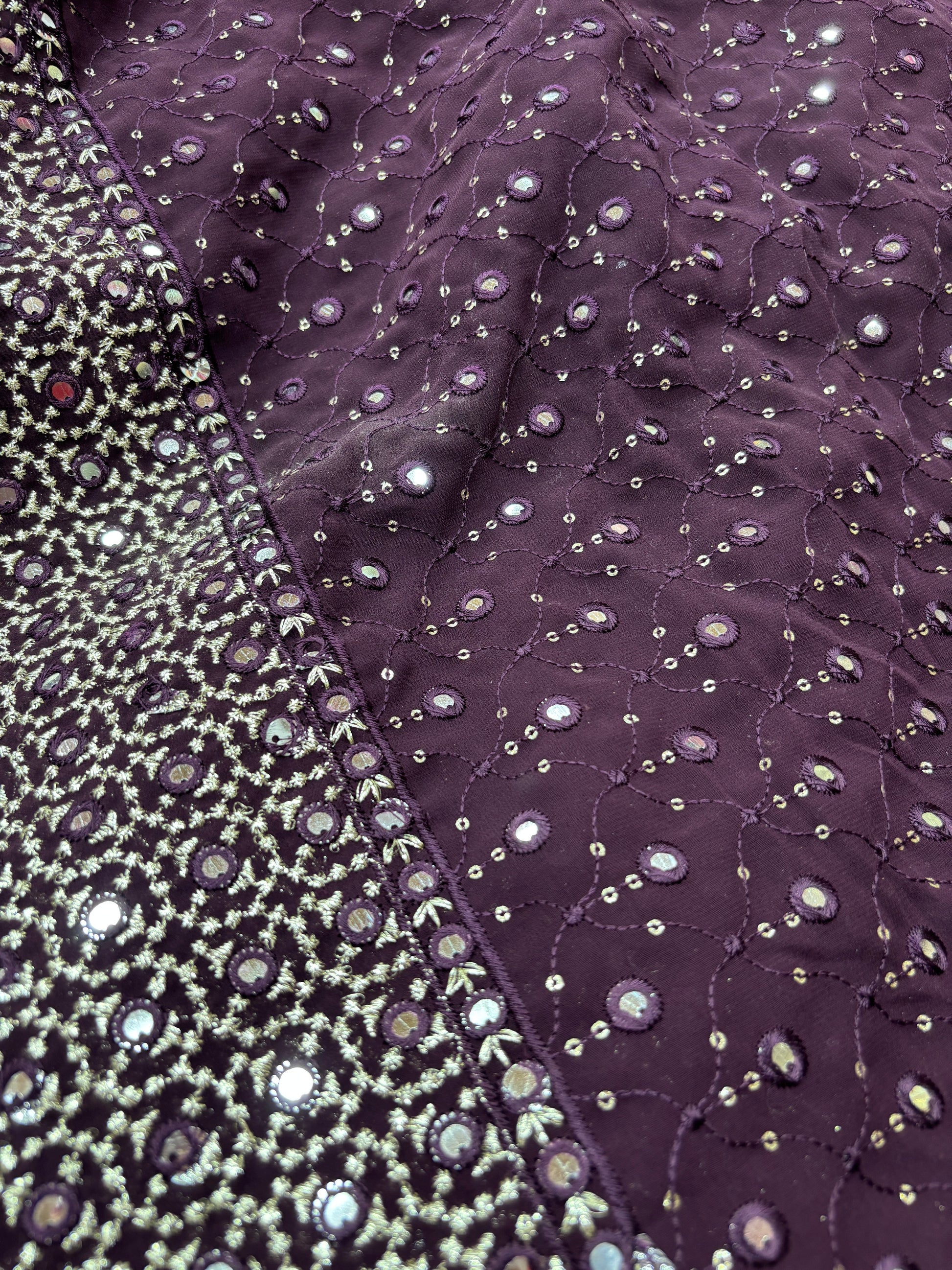 Embodying the mystique of deep plum and the charm of mirror work, this fabric is a showstopper. It features all-over thread embroidery in delicate loops, adorned with small mirror disks that catch light from every angle. The border boasts dense embroidery with clustered mirrors, making it ideal for dupattas, anarkalis, and blouses. It’s an exquisite blend of contemporary design and traditional Indian craftsmanship, perfect for sangeet nights or intimate wedding events.
