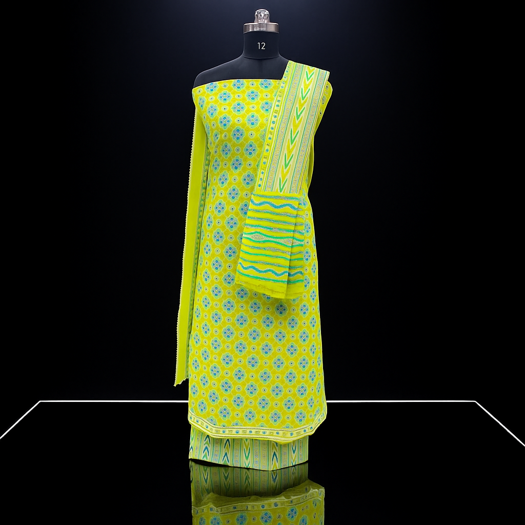 Radiating freshness, this vibrant lime yellow set is detailed with turquoise and white floral prints. The kurta, bottom, and dupatta are beautifully coordinated with block-printed designs, making it a sunny choice for casual days and summer gatherings.