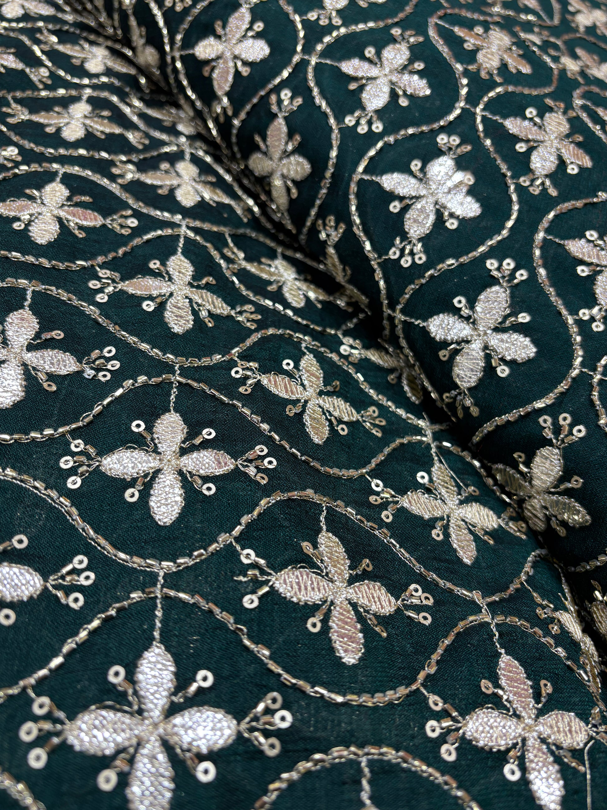 This elegant dark green georgette fabric features intricate silver thread embroidery in delicate floral motifs, creating a luxurious and refined aesthetic. The detailed flowers are accentuated with subtle sequin work and beaded outlines, giving it a glimmering, festive appeal. The flowing texture of georgette ensures both comfort and graceful drape, making it ideal for sarees, lehengas, and festive kurta sets. The shimmering surface adds a touch of glam while keeping the look sophisticated. A perfect pick for weddings, evening wear, and statement ethnic creation.