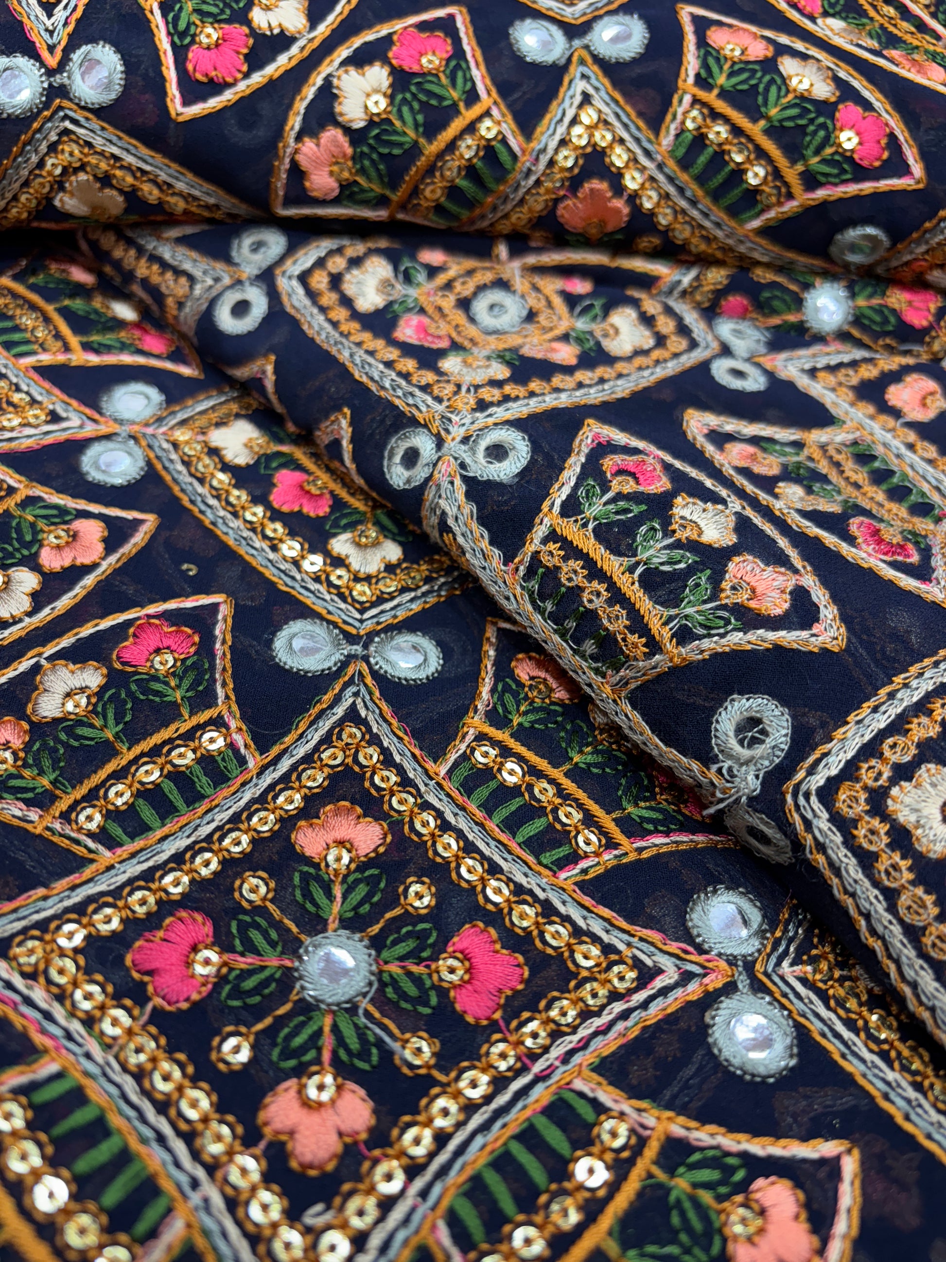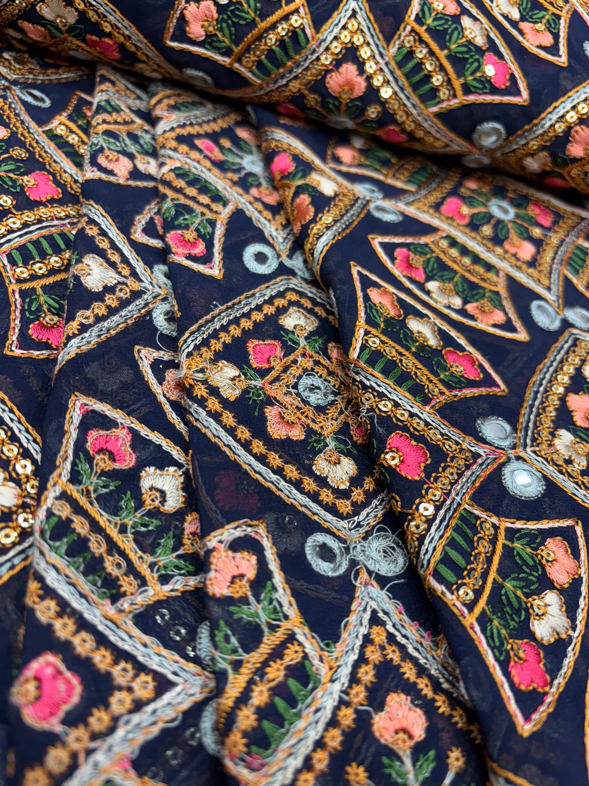 Step into a world of opulence with Midnight Mirage Embroidery. The rich navy blue backdrop is intricately embroidered with radiant floral patterns in vibrant shades of coral, ivory, and gold. Embellished with tiny mirrors and glistening sequins, this fabric promises a royal aura. Ideal for festive lehengas, kurta sets, or jacket ensembles, it captures the mystique of a starry night garden — making you the center of attention at any celebration.