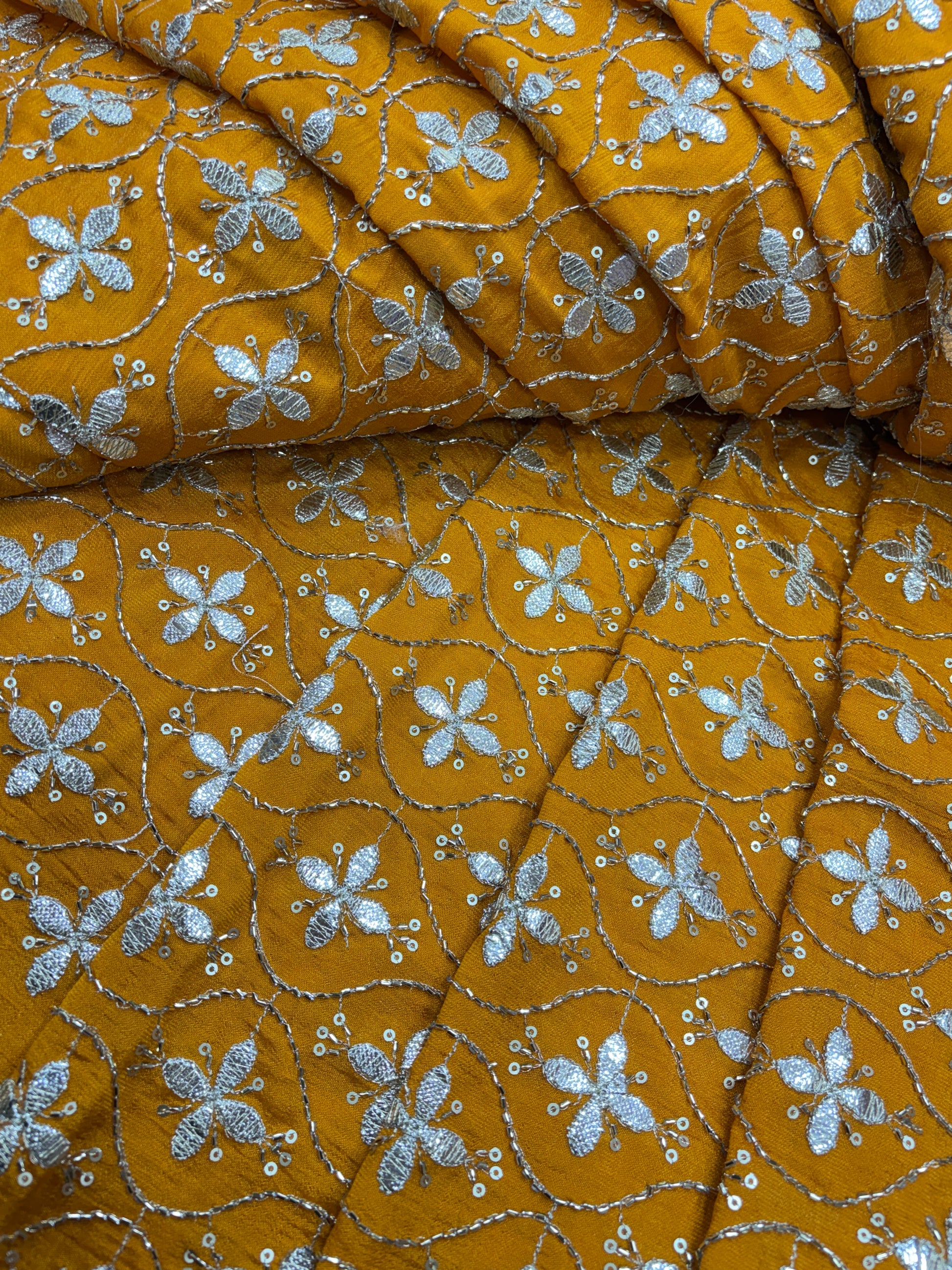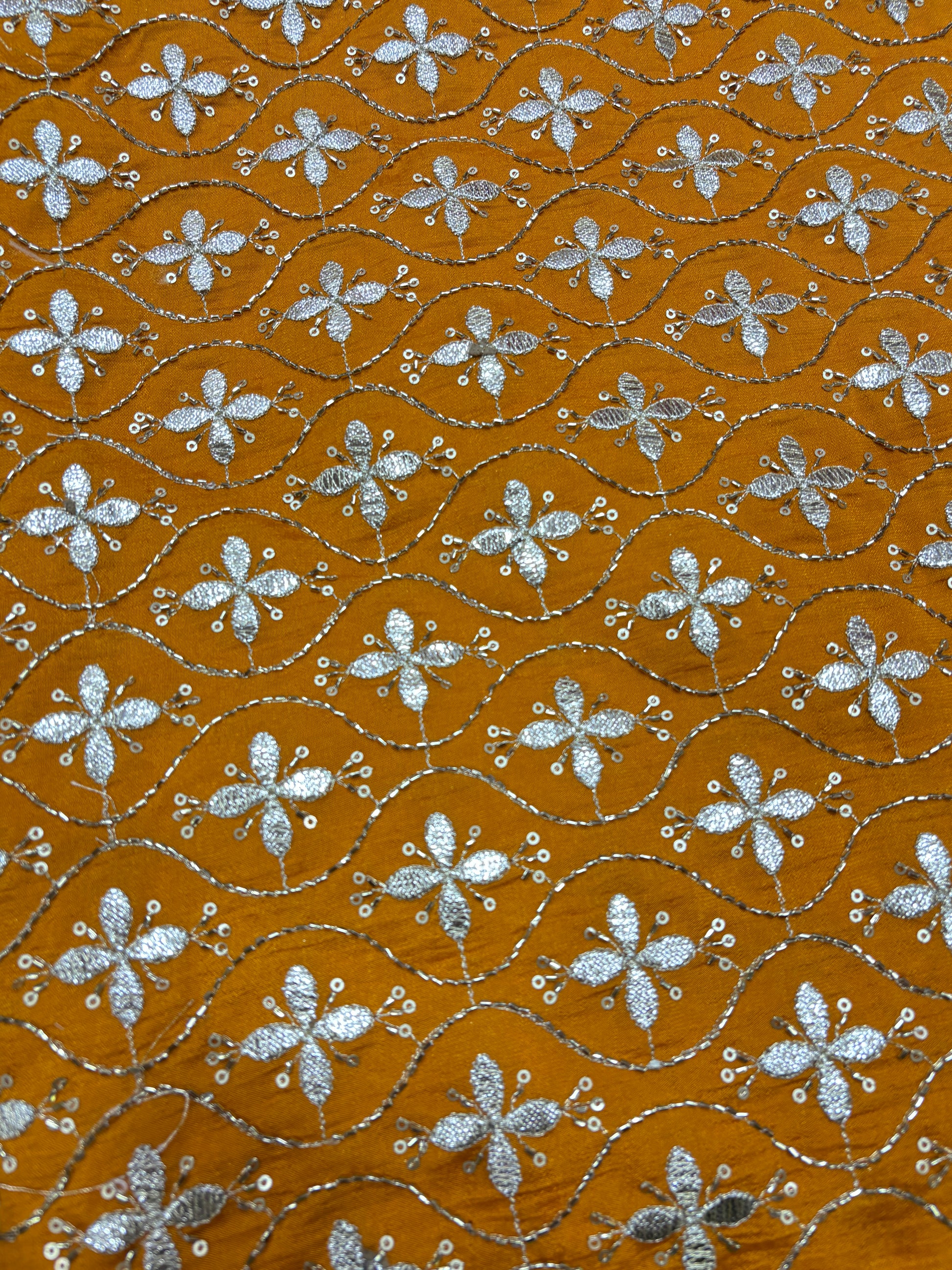 This vibrant mustard yellow fabric radiates festive charm with its delicate silver floral embroidery, forming a rhythmic lattice across the surface. Each motif is accentuated with subtle sequin detailing, giving it a soft shimmer and enhancing its elegance. The rich silk velvet base adds a luxurious depth and smooth drape, perfect for occasion wear, kurtas, or festive lehengas. With its balanced blend of traditional aesthetics and modern shine, this fabric brings both comfort and visual appeal. A must-have for bright, celebratory looks.