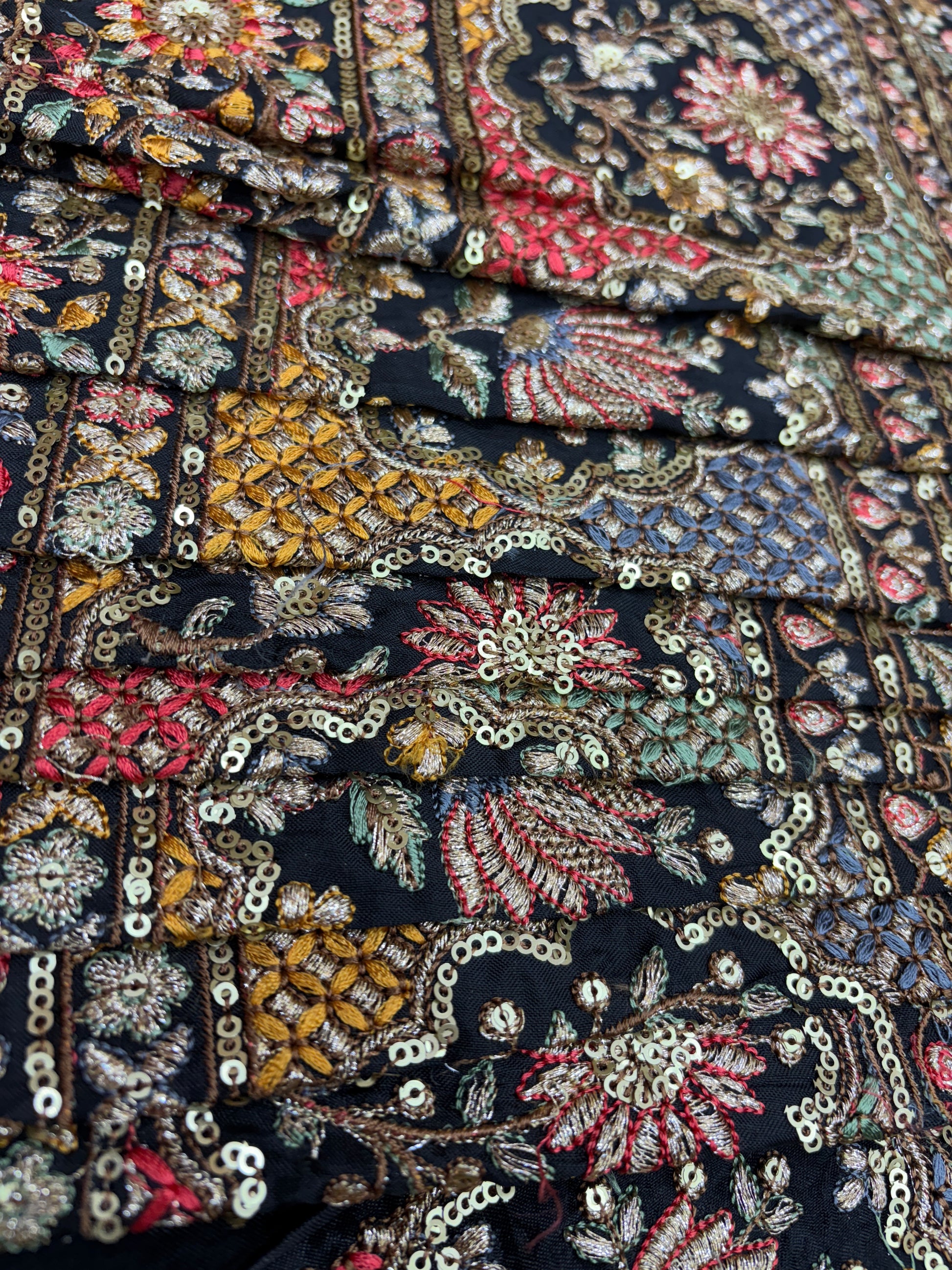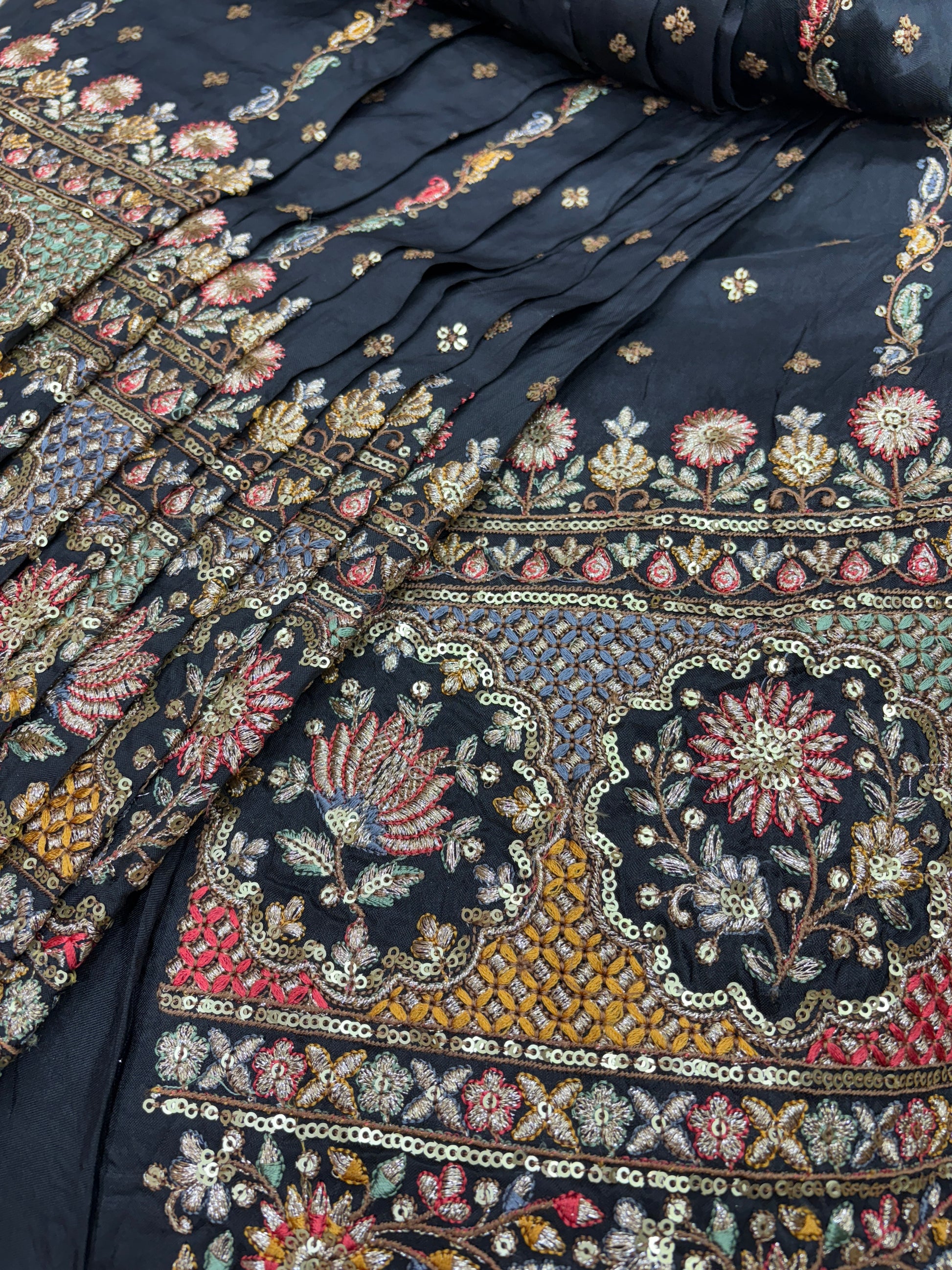Step into royal grandeur with Noir Garden Majesty — a luxurious black fabric boasting intricate floral embroidery interspersed with glinting sequins. The ornate border, woven with metallic threads and rich colors, lends a majestic finish. Perfect for creating opulent lehengas, sarees, or heavily embroidered gowns ideal for weddings and grand festivities.