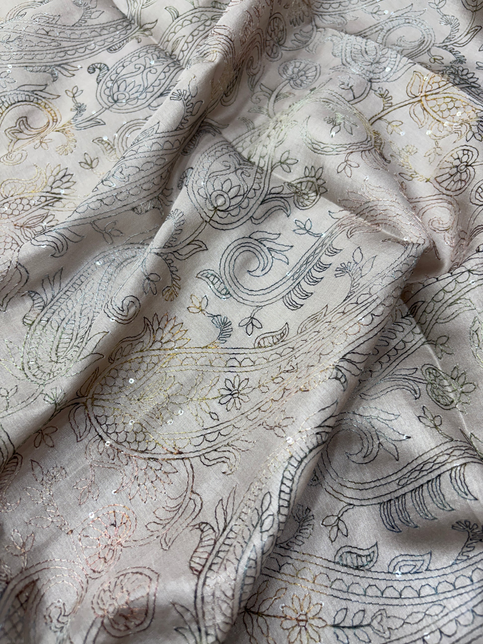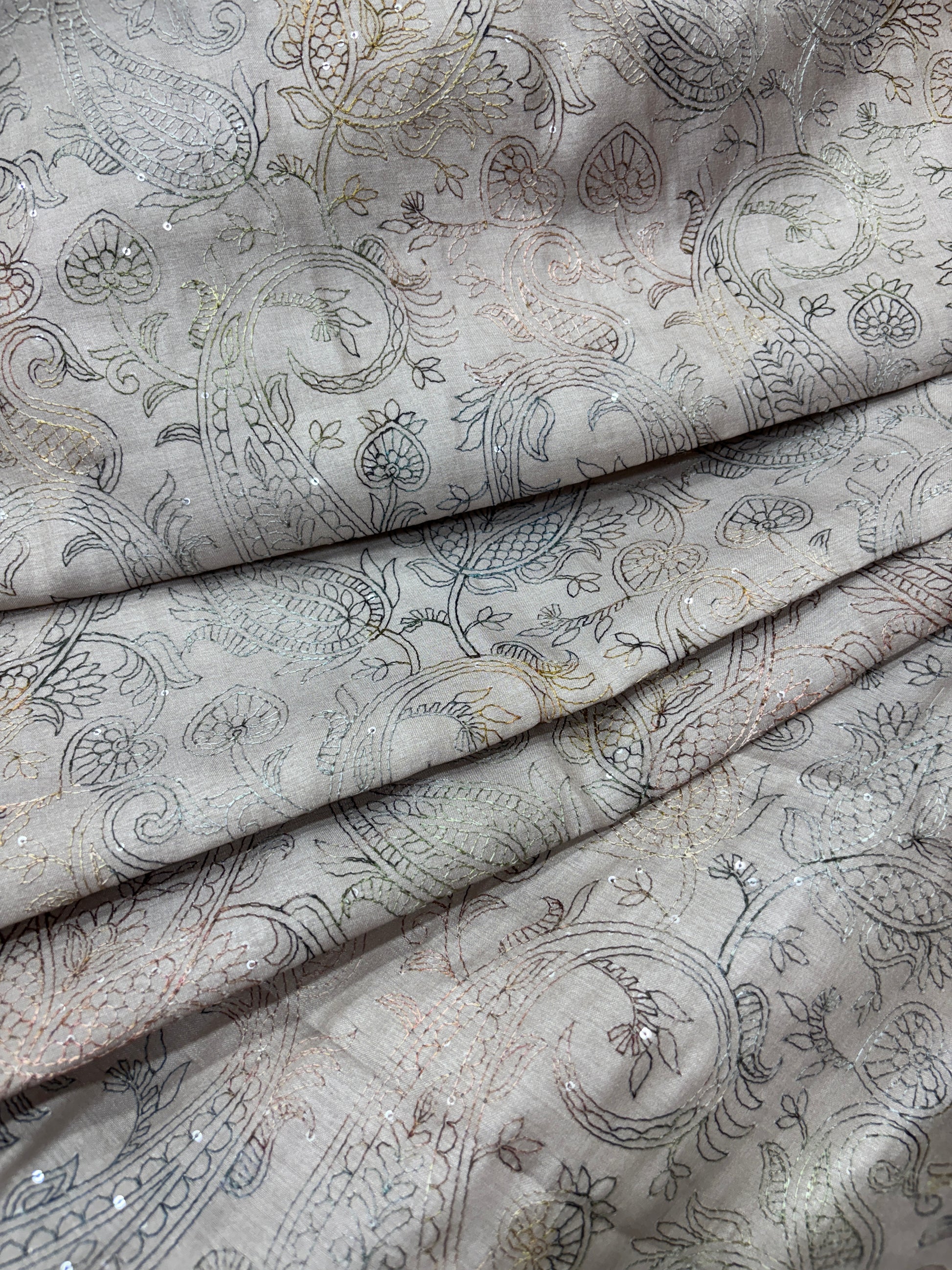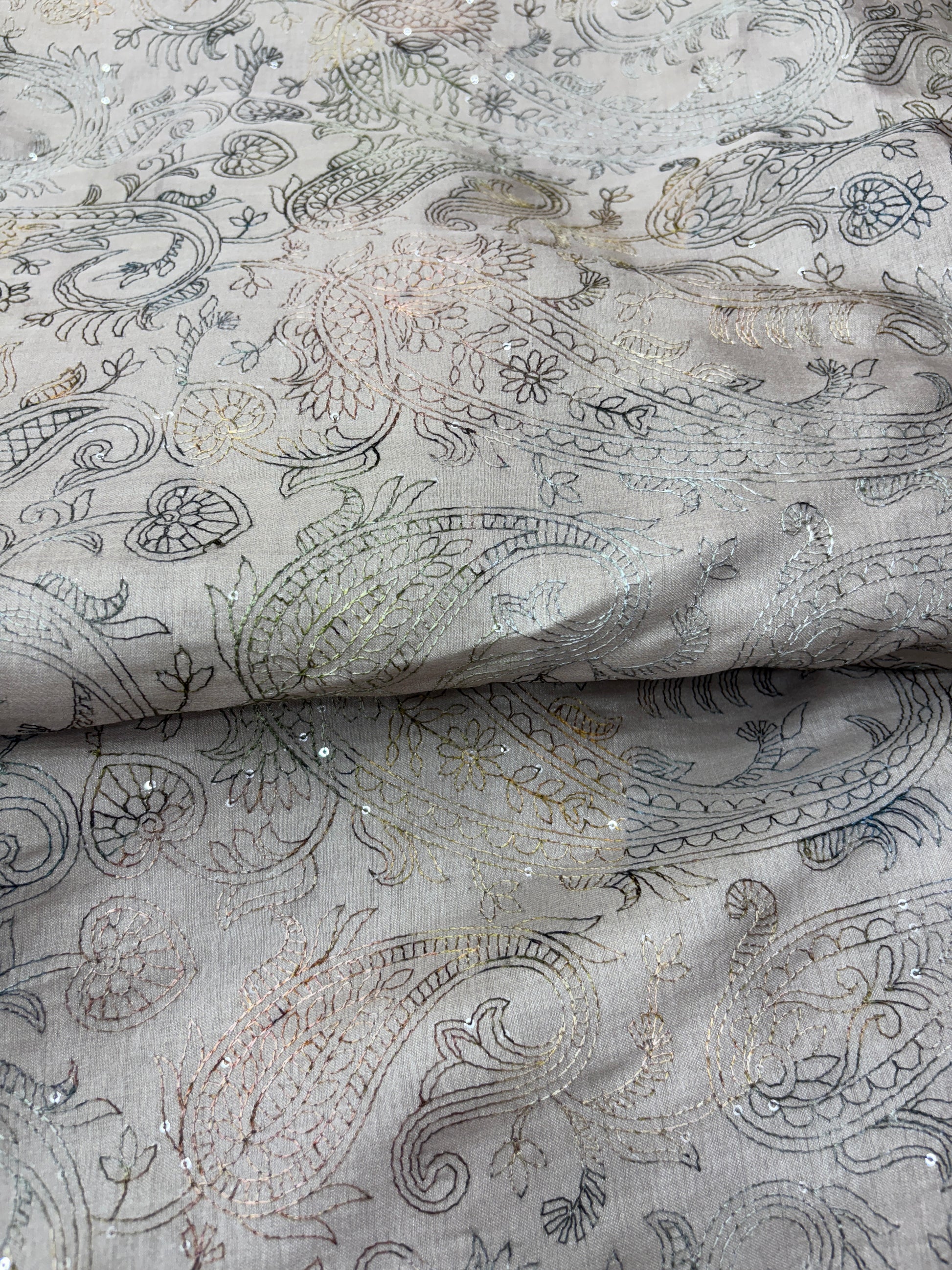 A timeless ode to tradition, this elegant beige fabric is adorned with intricate paisley and floral motifs meticulously embroidered in fine tonal threads. Scattered with dainty transparent sequins that gently catch the light, the fabric radiates a soft, understated shimmer, making it perfect for both day and evening wear. Ideal for creating sophisticated ethnic ensembles such as sarees, salwar suits, or dupattas, this fabric is your go-to for graceful occasions where simplicity speaks volumes.