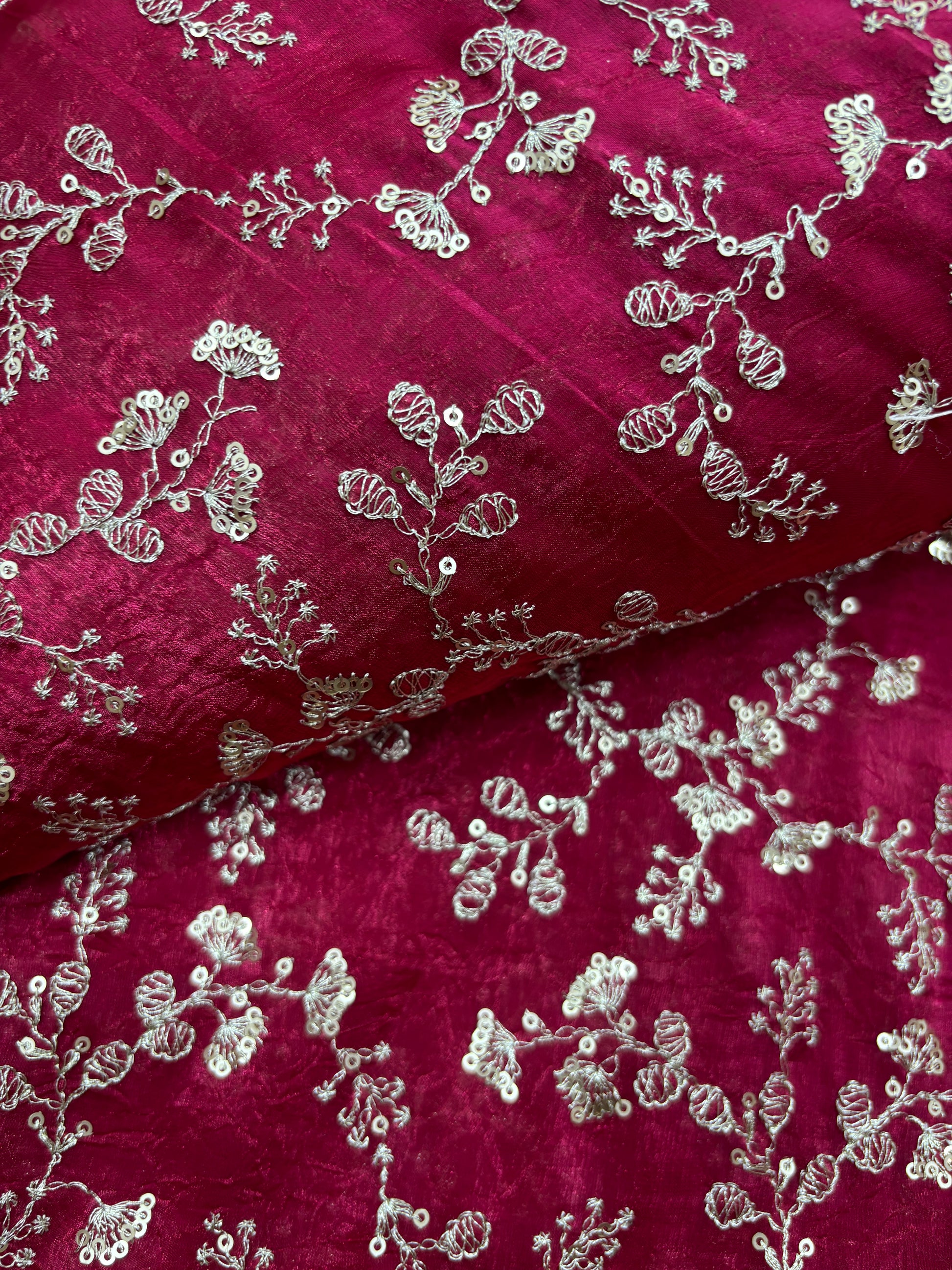 Graceful and feminine, this raspberry-toned fabric is adorned with delicate floral vines embroidered in ivory zari and sequin work. The fine detailing mimics the soft elegance of blooming shrubs across a forest floor, making it perfect for soft-flowing garments like anarkalis, sarees, or dupattas. Its subtle shimmer and pastel palette make it a favorite for bridesmaids, haldi outfits, and any occasion that calls for understated beauty.