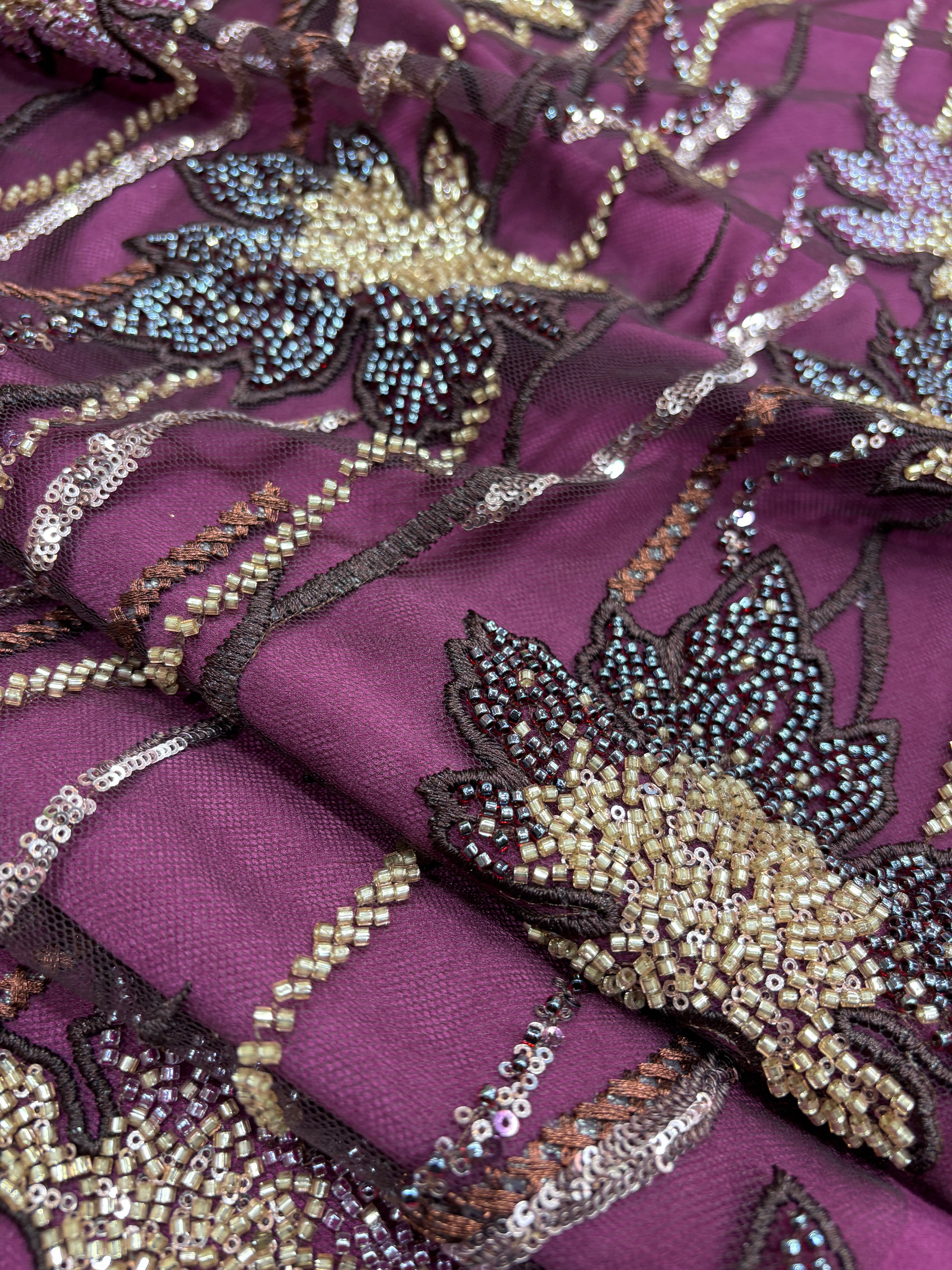 This regal plum net fabric is adorned with intricate floral embroidery featuring rich tones of gold, bronze, and metallic blue. The bold flower motifs are brought to life with dense handwork using glass cut beads, sequins, and thread embroidery. Its vibrant base and high-shine embellishments create a luxurious contrast, making it ideal for festive wear, lehengas, statement dupattas, or designer blouses. The elegant play of texture and color adds dimension and drama to any ensemble. A perfect pick for celebrations that call for standout style.