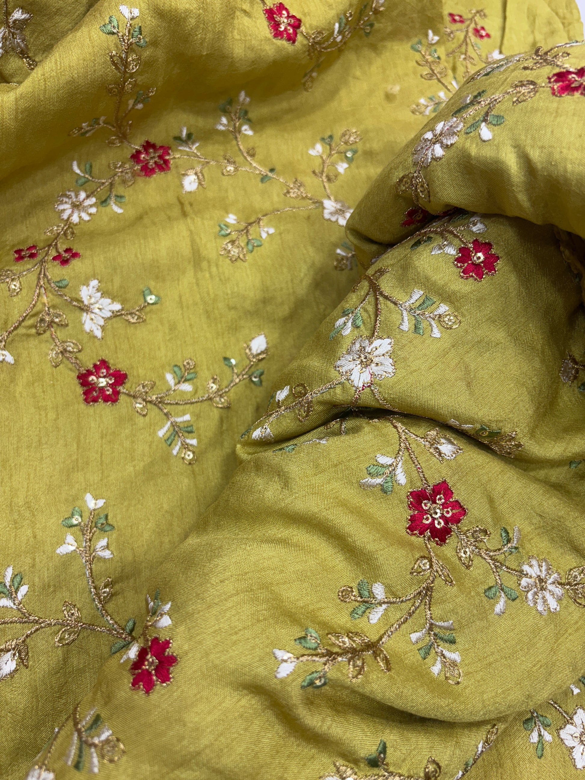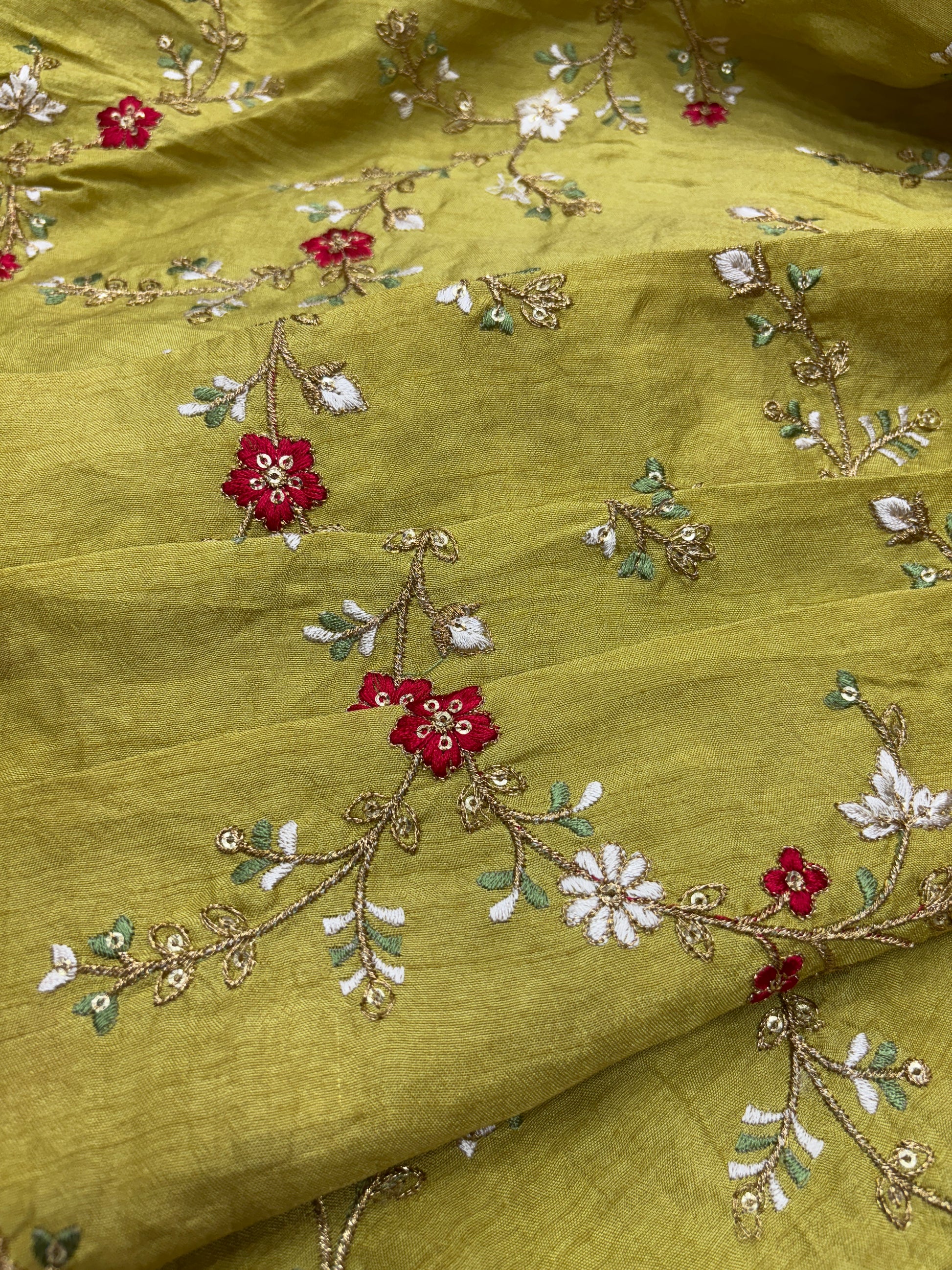 Immerse in the timeless grace of this soft cotton silk fabric, drenched in a warm mustard yellow tone with hints of golden sheen. It features intricate floral embroidery in white, red, and green thread, gracefully brought to life with gold zari detailing and scattered sequins. The fabric's natural texture and fluid drape make it ideal for festive kurtas, sarees, or ethnic co-ords. Its lightweight yet lustrous appeal ensures both comfort and sophistication. An exquisite blend of tradition and finesse for every designer wardrobe.