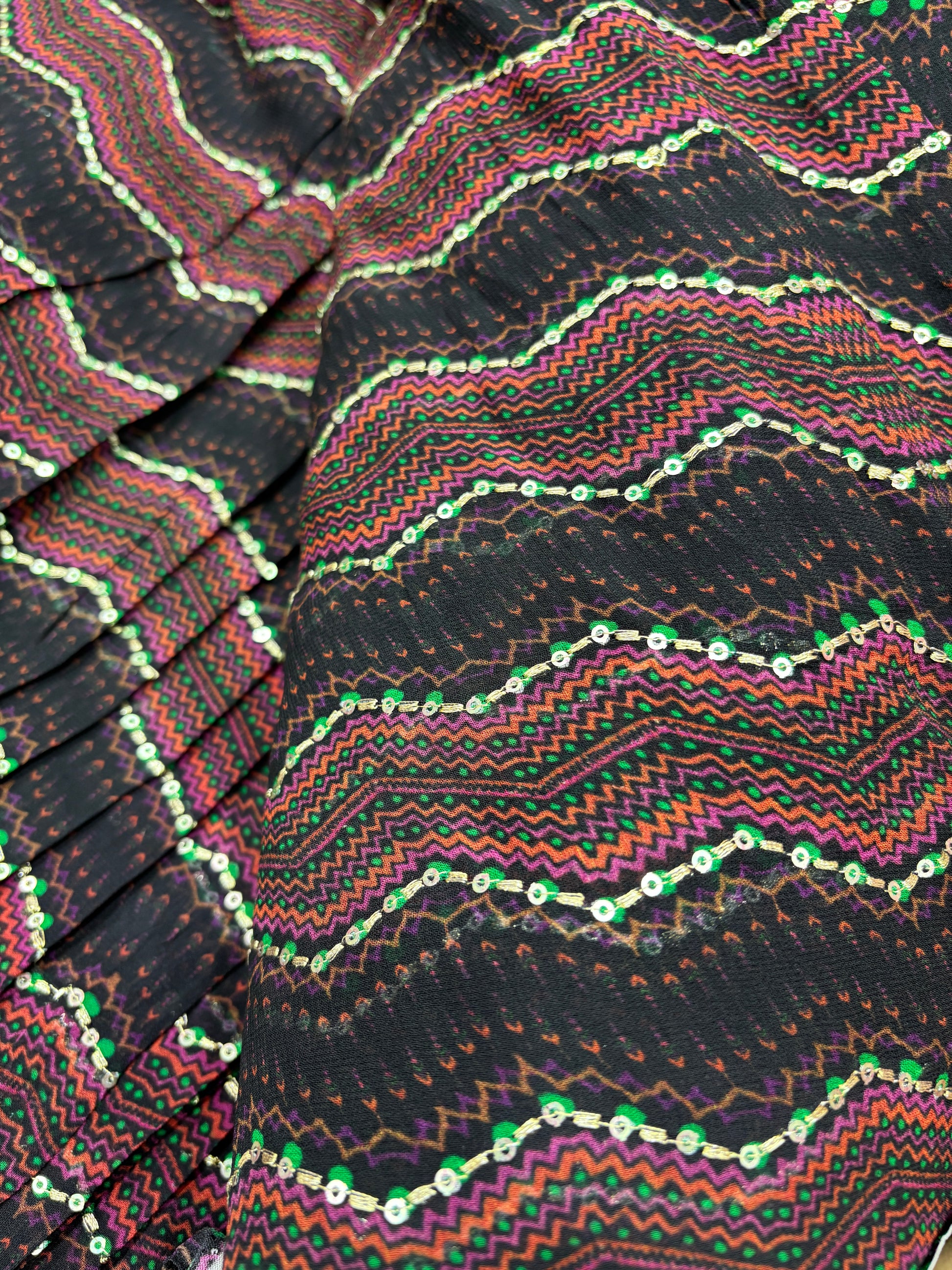 Dive into the rhythm of traditional flair with this black georgette fabric, featuring vibrant zigzag multicolor patterns. Accentuated with glimmering mirror sequins and neon green threads, it brings a festive energy to any outfit. The lightweight georgette base offers a fluid drape, making it ideal for sarees, skirts, or designer fusion wear. Each pleat sparkles subtly, catching the light with every movement. Add a touch of ethnic vibrance to your creations with this playful yet elegant textile.